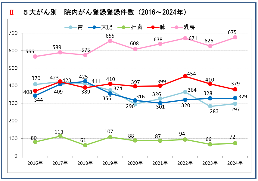 | Ⅱ5大がん別件数 | 我が国で罹患の多い5大がん(胃・大腸・肺・乳・肝)について年別推移を集計 | |