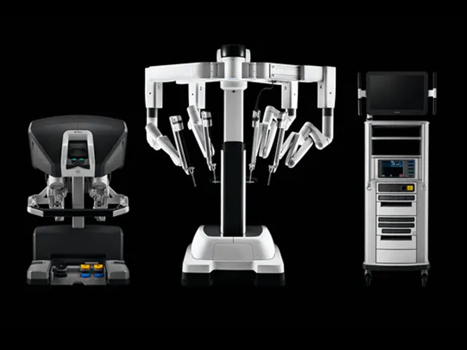ダビンチ手術では、画面が拡大できること、3Dで見えることなどにより、より細かい手術が可能となり、細い血管も見逃さず、止血することが可能になります。出血量は減少します。アームの操作は機械を介して行いますから、手の震えも伝わることなく、操作が可能です。アームの動きも、手首の関節よりもっと可動域がひろく、自由に動けるので、狭いところでの操作も得意です。アームの動きが機械で操作されるので、創部に無理な力が掛からず、術後の痛みも従来の腹腔鏡より少ないです。