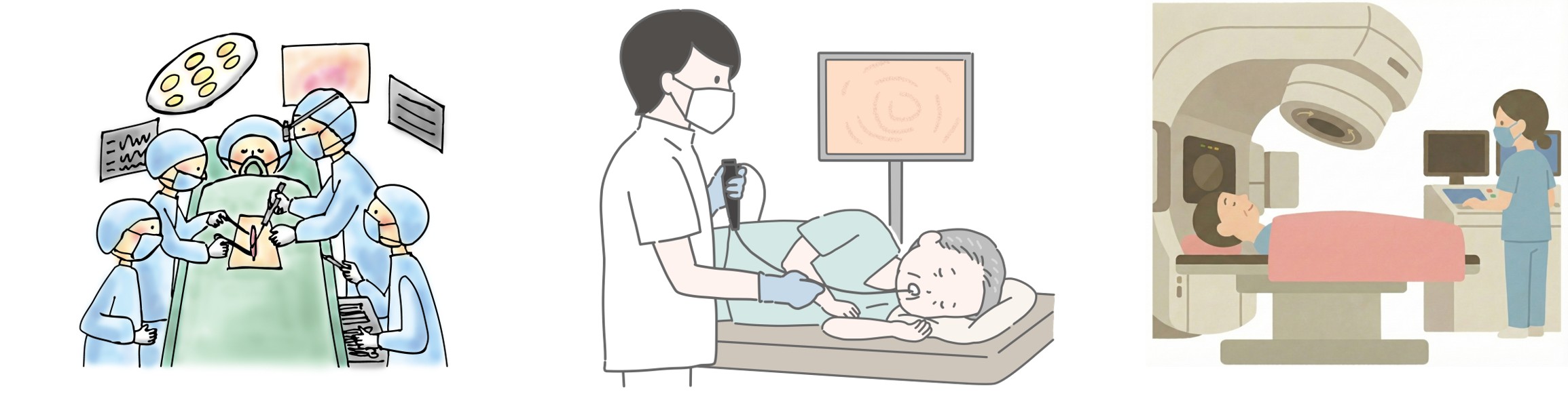 治療方法は、病気の進み具合により決まり、手術、化学療法、放射線療法が治療の3本柱です。