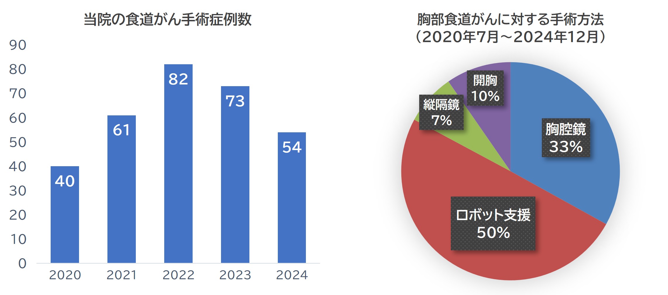 広島市民病院では、2020年以降、年間約60~70件の手術を行っています。また早期食道がんに対する内視鏡治療も年間約60-70件行っています。