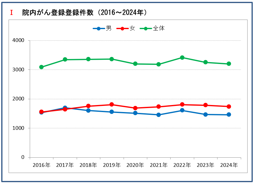 院内がん登録件数を年次推移で全数及び性別で集計 | |