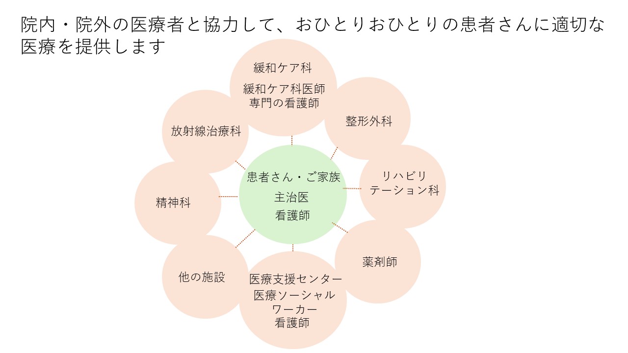 ・緩和ケア科は、主治医と協力して専門的な緩和ケアを提供する診療科です。
